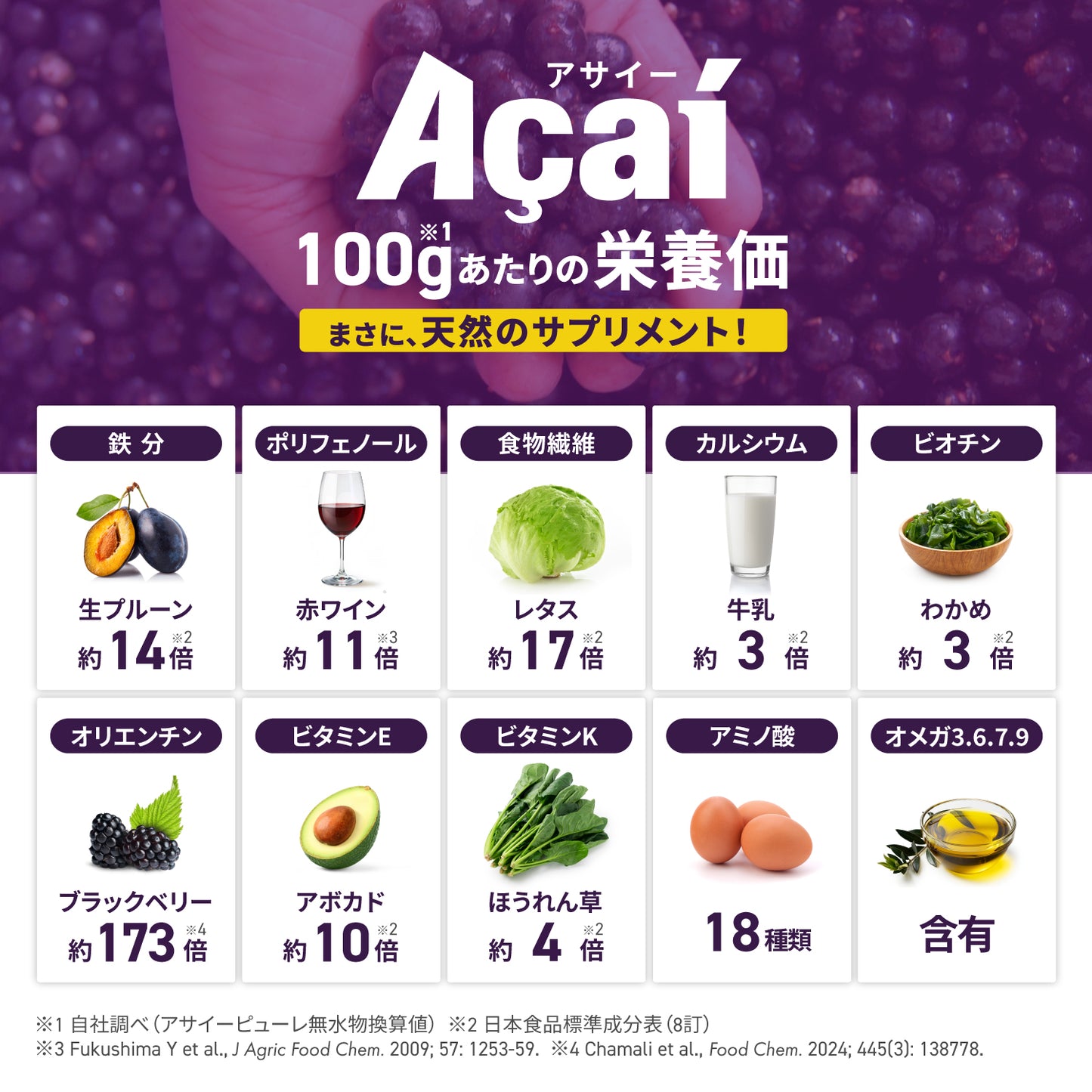 アサイーは赤道直下の強い紫外線と強烈な雨といった過酷な環境で育つため、環境ストレスによる活性酸素と戦う抗酸化物質を蓄えます。その代表格がポリフェノールであり、ワインの様な深紫色がその多さを物語っています。