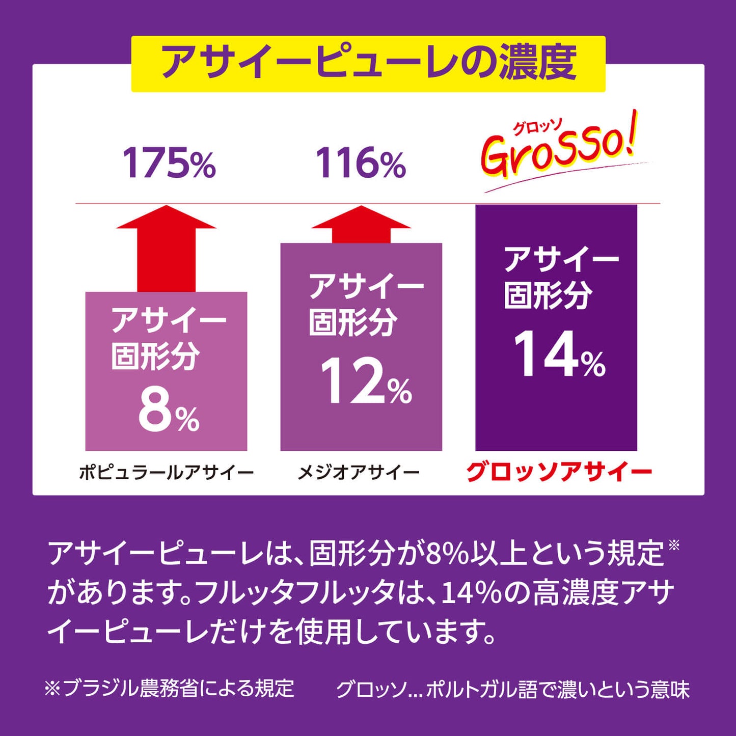 ブラジルでは、アサイーピューレは農務省が定めた基準により、濃度(アサイーの含有量)でポピュラール(8%)、メジオ(12%)、グロッソ(14%以上)の3つに分類されています。